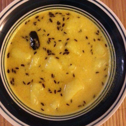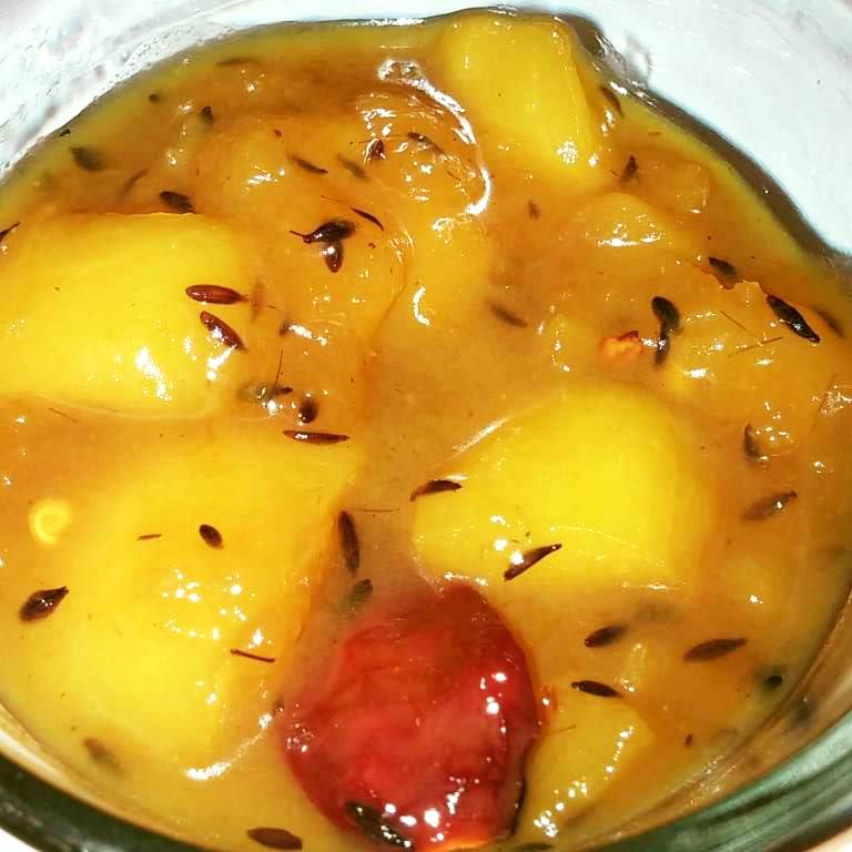 Raw Mango cooked in Sugar syrup & seasoned with Indian spices.its an accompaniment to an Indian meal.Serve with Rice,dal or Chapati & paratha