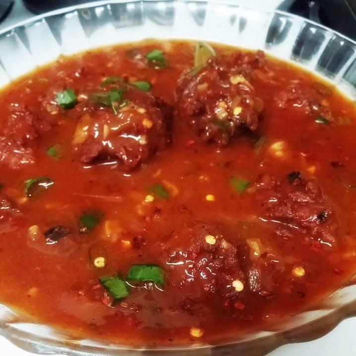 Minced Chicken balls Seasoned with soy sauce ,vinegar & simmered in Gravy .NO MSG used.