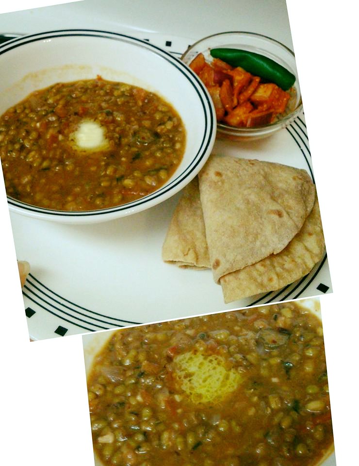 Heat a pressure cooker add ghee.then bay leaves.add garlic -ginger cook till raw aroma goes off.add onion sauteed till it becomes pink in color.add green chillies & soak moong dal & tomatoes & salt. saute .adding dry spices except garam masala.once it started leaving oil .add kasoori methi ,green coriander leaves & garam masala.give a stir .add water check seasoning before closing lid.