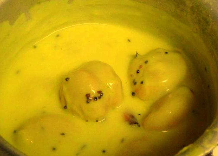 Gram flour Dumplings simmered in Gram flour, yogurt &Spices Mixture.